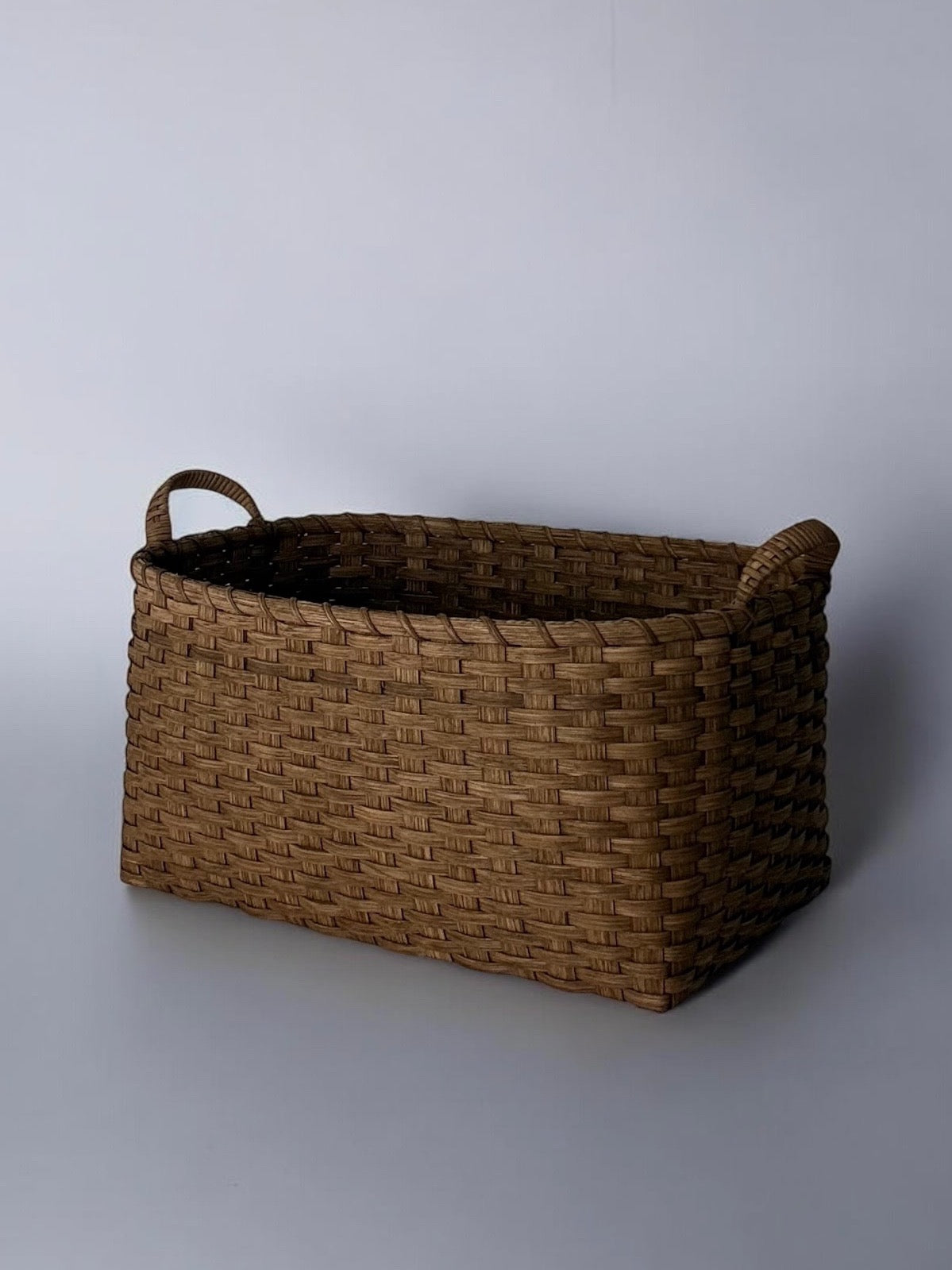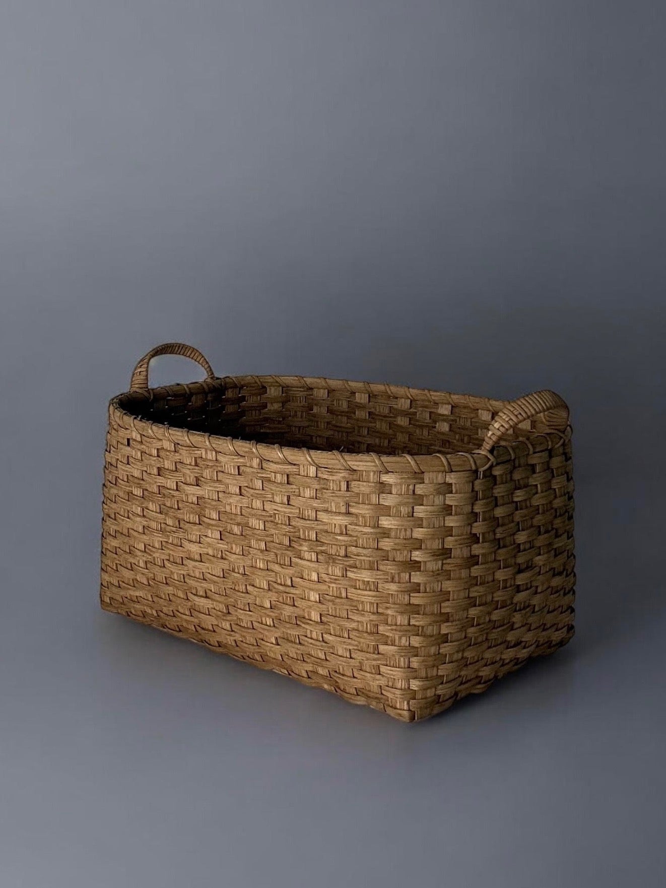 A generously scaled vessel designed to live seamlessly between your floor, wall, and tabletop. Whether it is gathering rumpled throw blankets, corraling children's toys, or transporting fresh linens from room to room, this piece is the beautiful workhorse of the home. Inspired by traditional New England utility, it is structurally designed to be hung when not in use, turning everyday storage into woven architecture. Finished with uniquely tactile wrapped handles and available in five distinct finishes to perfectly ground your space.