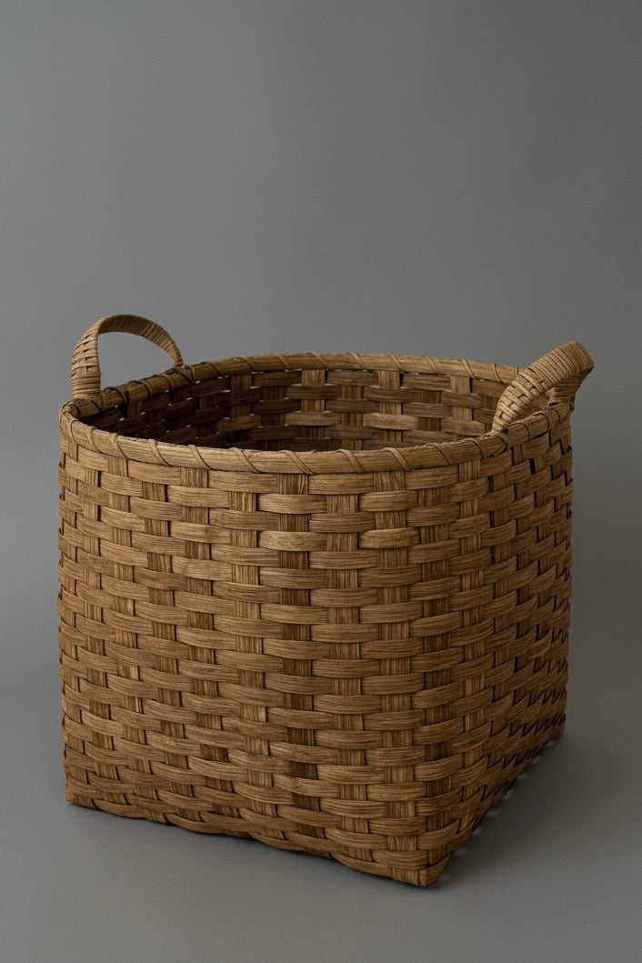 This piece is defined by its versatile shape: a square bottom for stability that gently curves into a generous, round top. Handwoven by us from natural rattan, the beautiful variations in the fibers ensure that your basket is a one-of-a-kind work of functional art. Extended, wrapped handles complete the design, offering both comfort and durability.