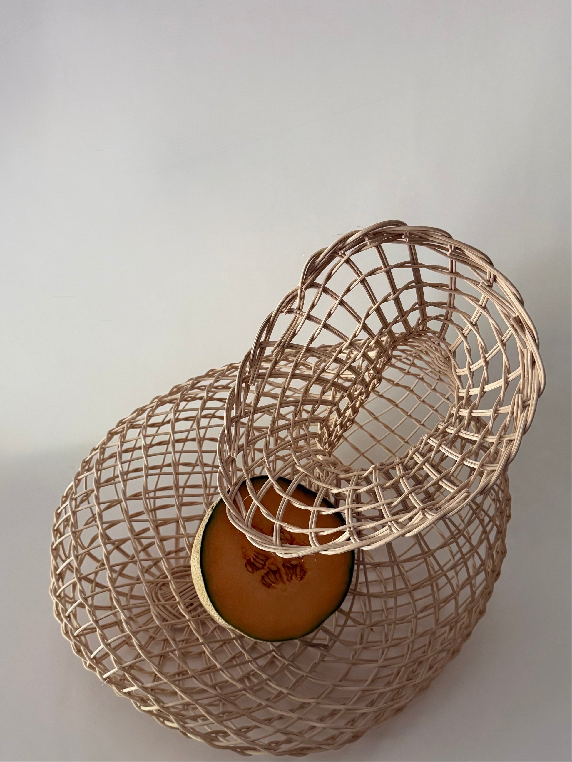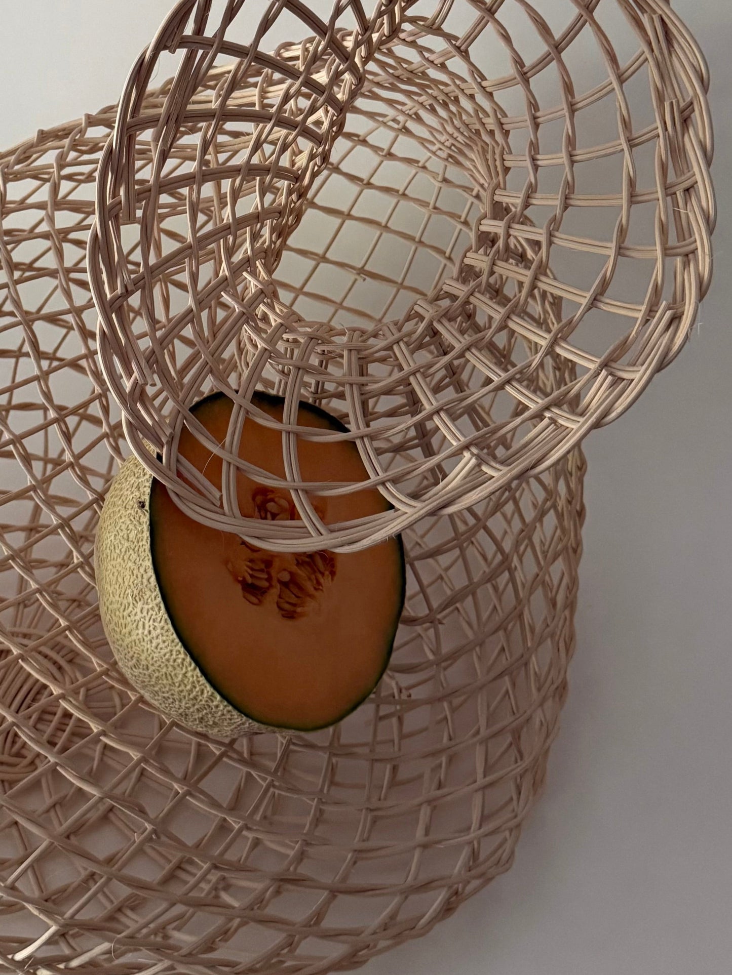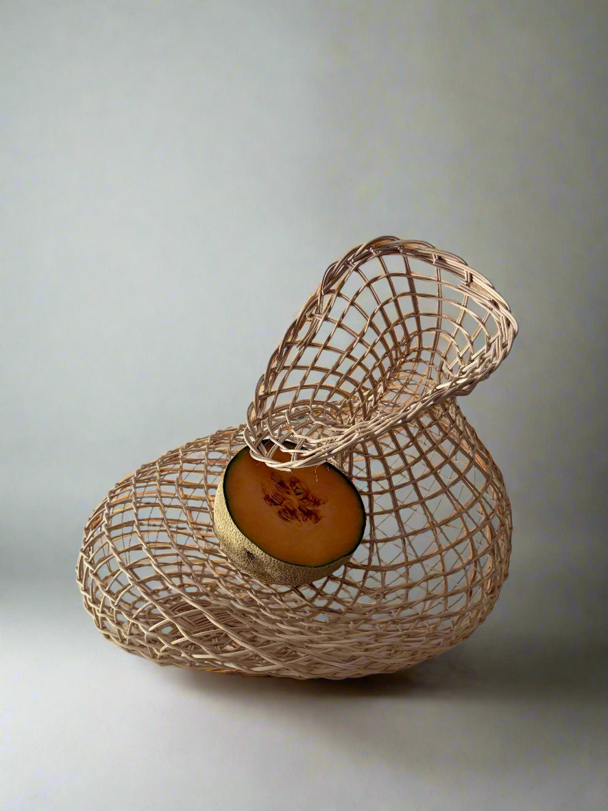 An open-weave, oversized traditional onion basket created to explore a vessel's boundaries through an organic shape that is more form than function. Suggested use as an object or a tablescape display for an offering of fruit or vegetables-- a conversation piece.