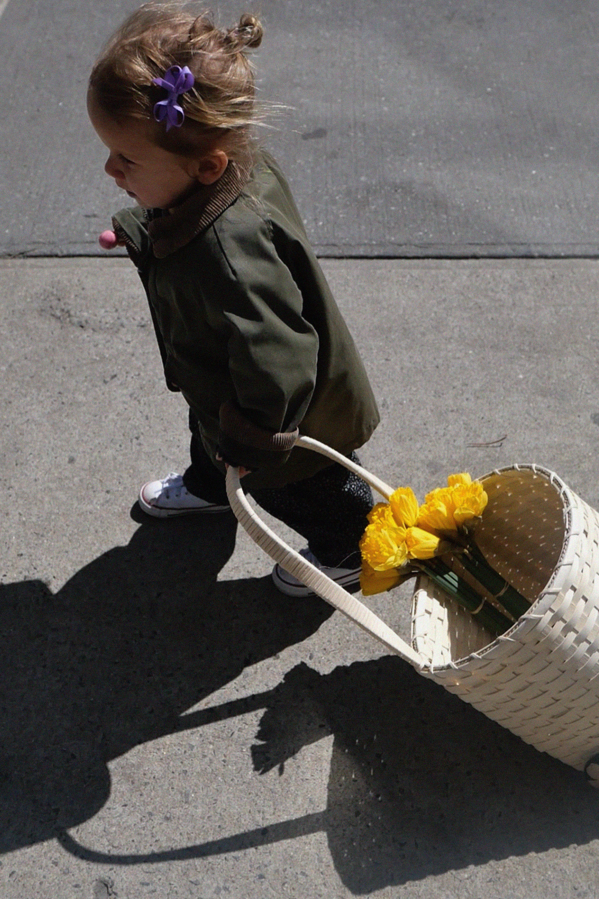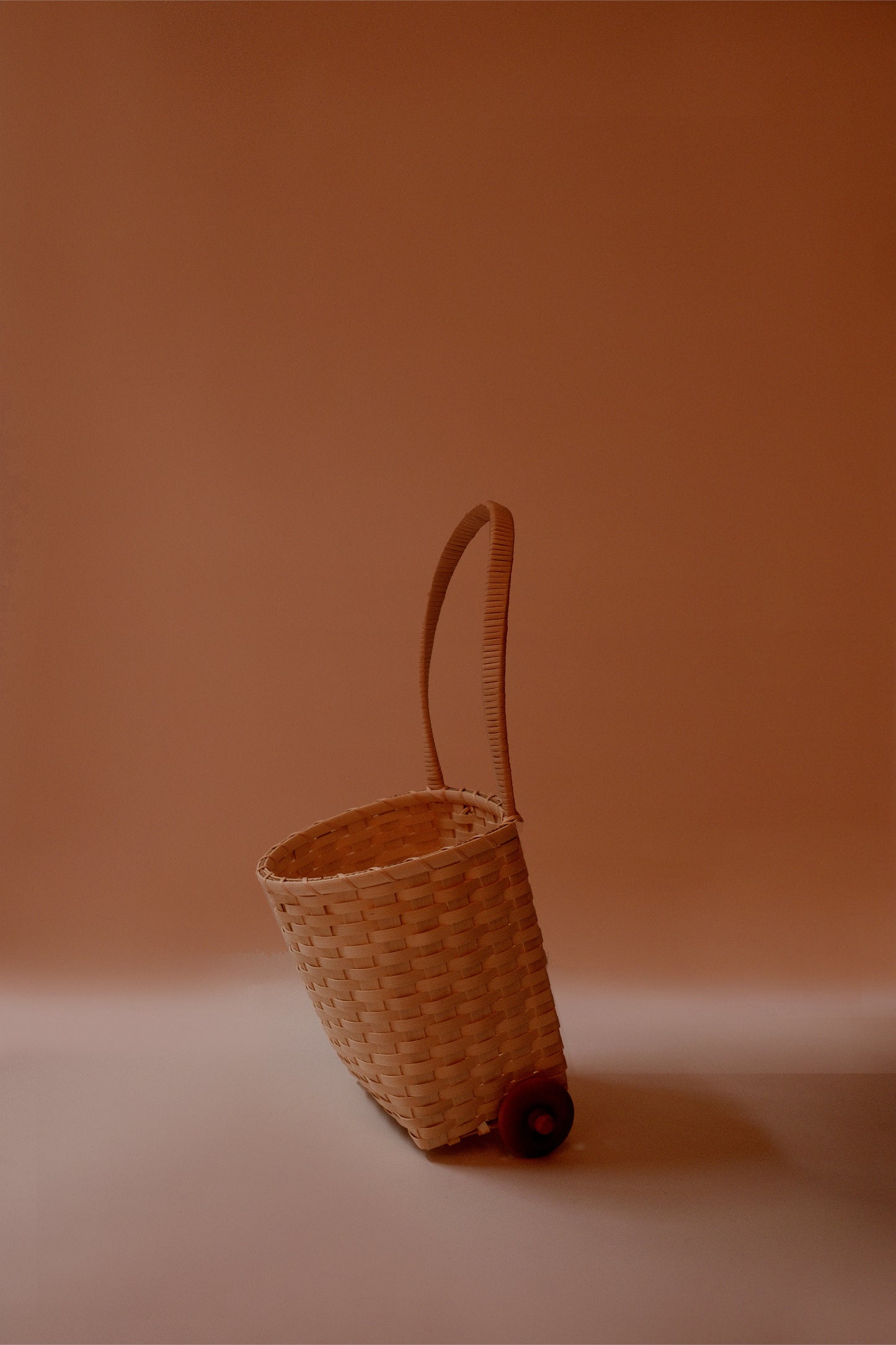 This is a shopping basket for your little ones. It's perfect for hauling chocolate croissants or daisies home from the market, gathering favorite toys, or taking a book collection on the go. The basket is made with durable rattan fibers intricately handwoven with hand-painted wooden wheels.