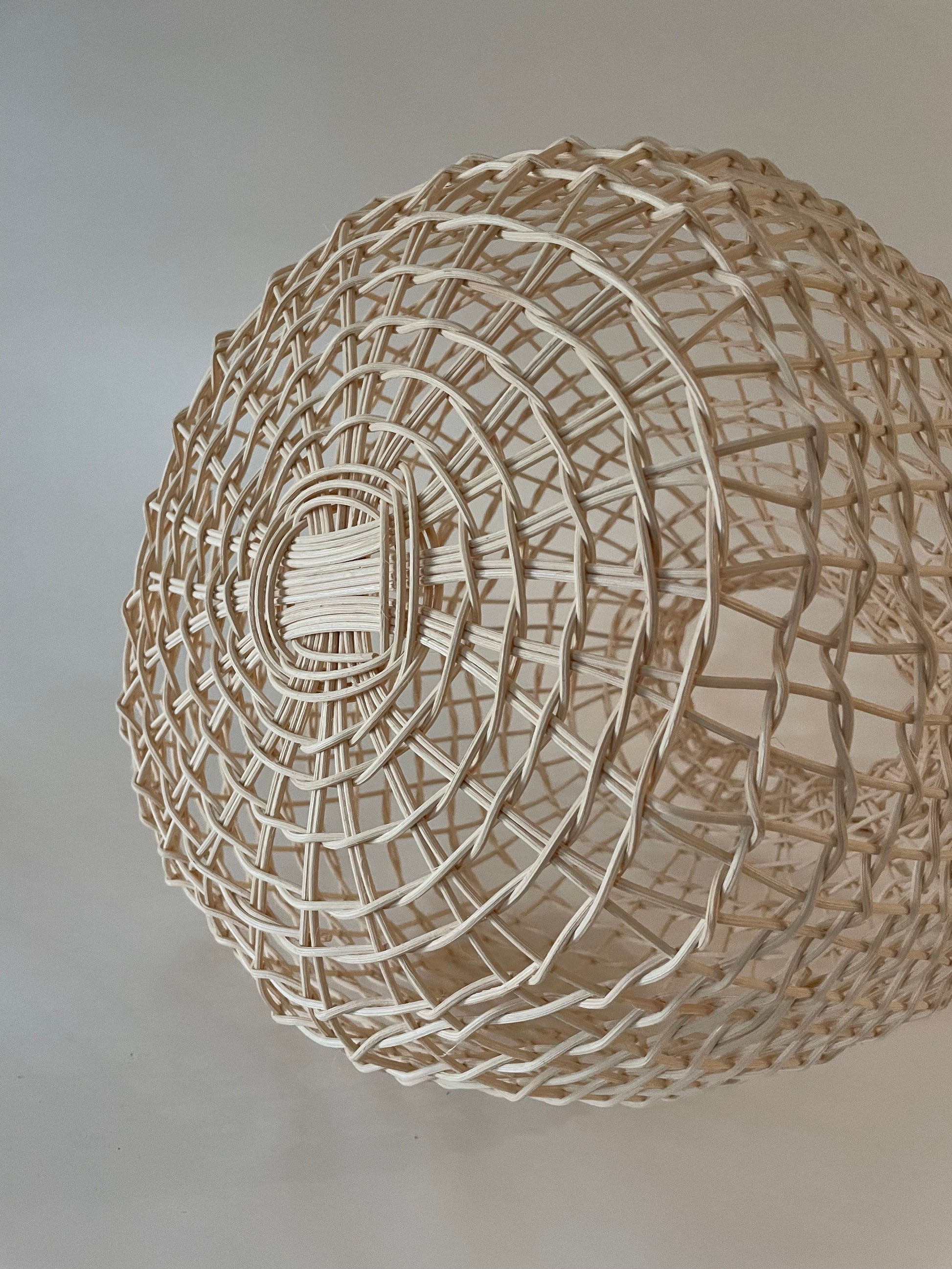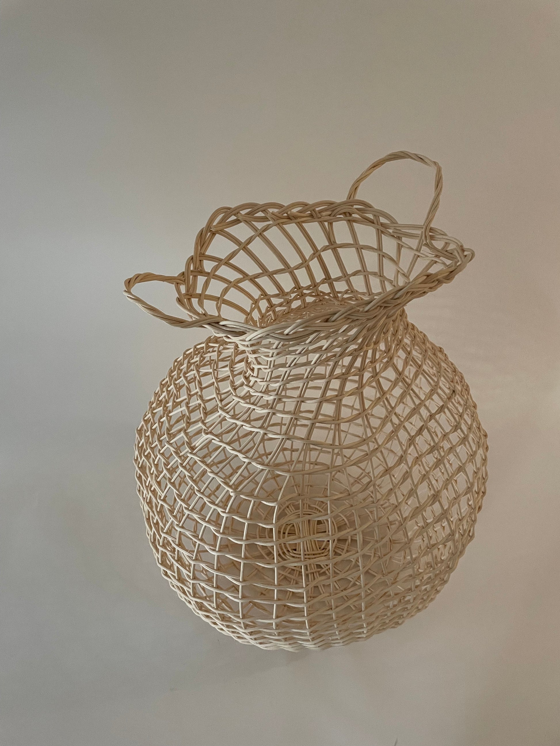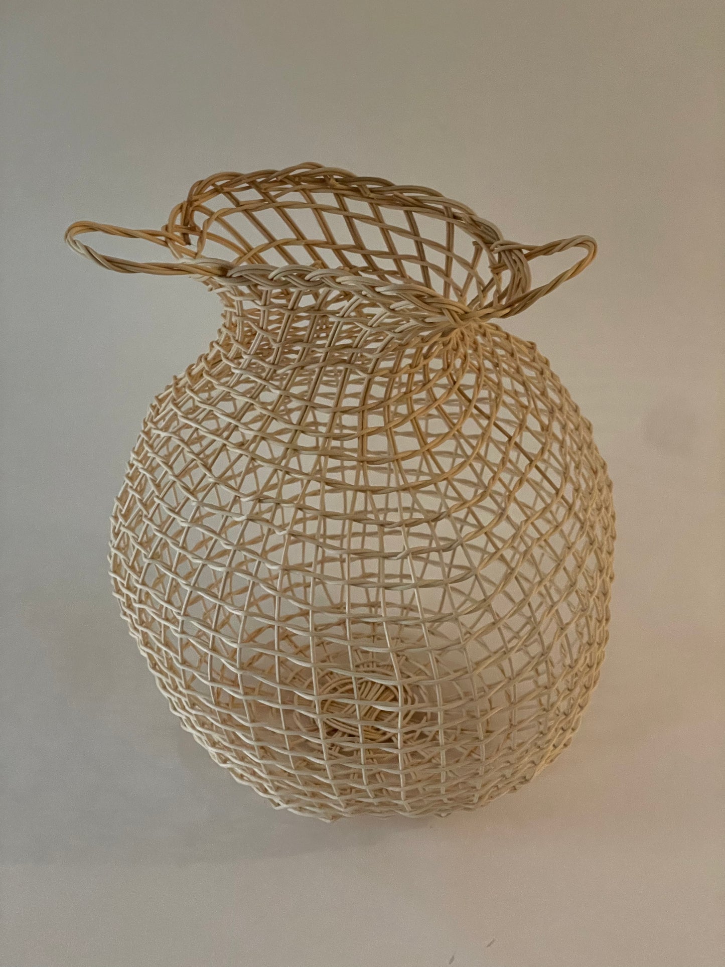 Decorative open weave vessel, braided rim, and handles, one-of-a-kind