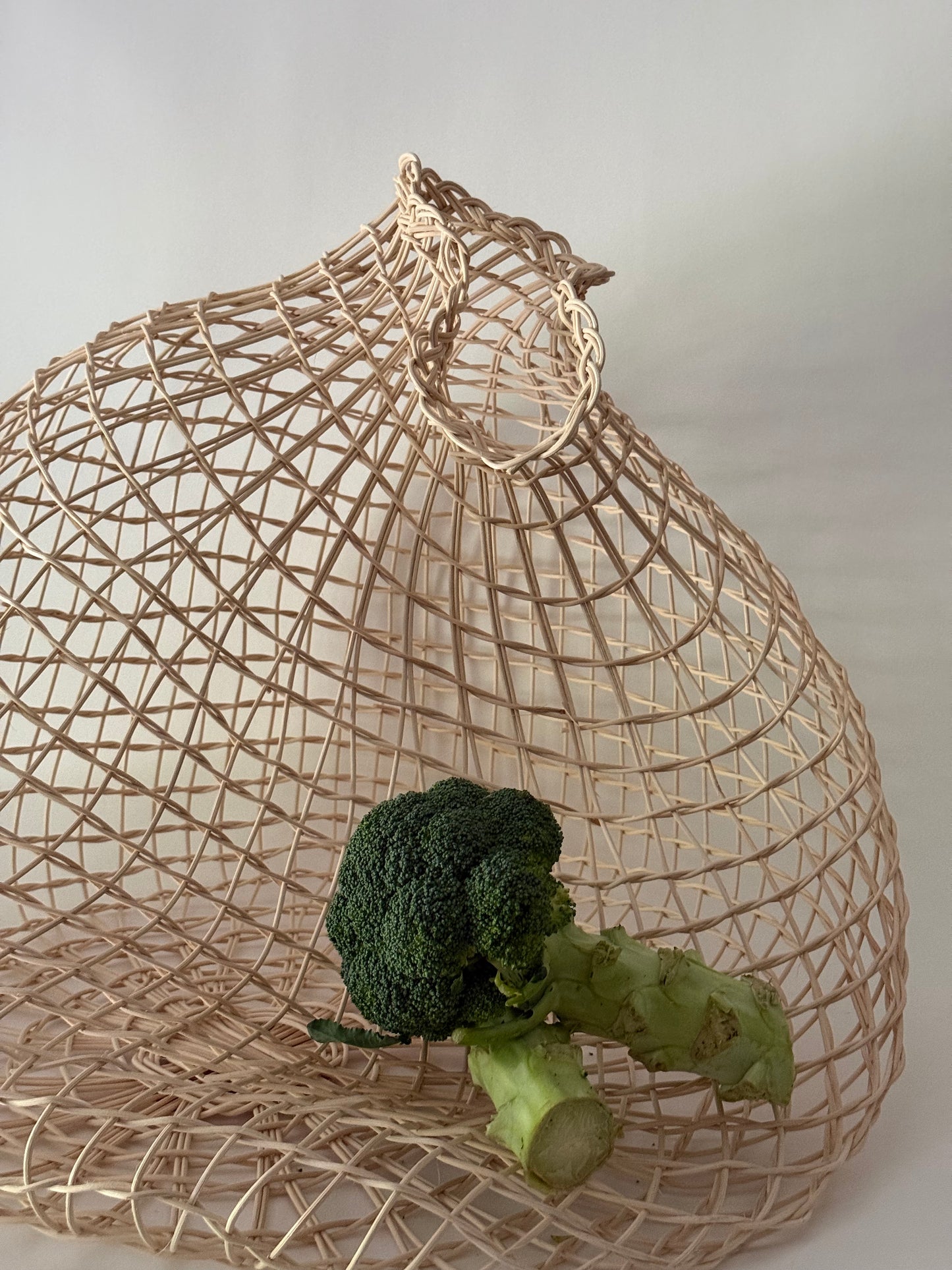 An open-weave, oversized traditional onion basket created to explore a vessel's boundaries through an organic shape that is more form than function. Suggested use as an object or a tablescape display for an offering of fruit or vegetables-- a conversation piece.