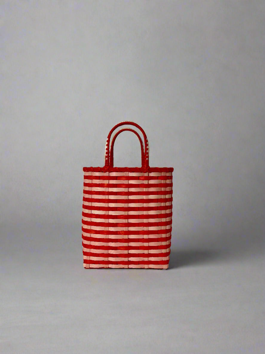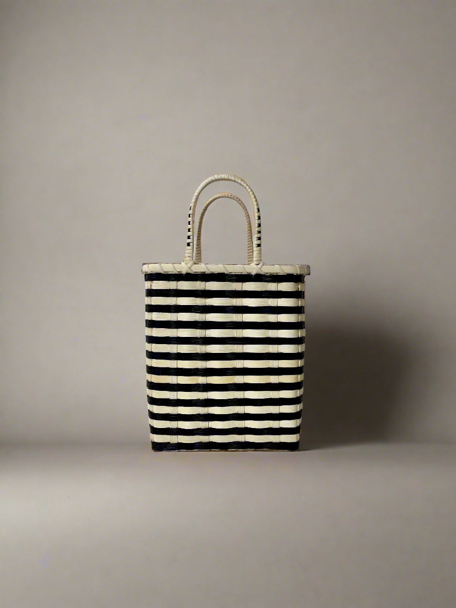 This fun, but practical basket is a sartorial alternative to a canvas tote. The perfect bucket shape and size, along with its oh-so-lightweight construction, make it a handsome everyday carry-all, picnic basket, or carry-on for jet-setting. The closed bottom and wrapped side handles make the Retro-Travel Tote an easy choice for a gift or an elevated home storage item when not in use.